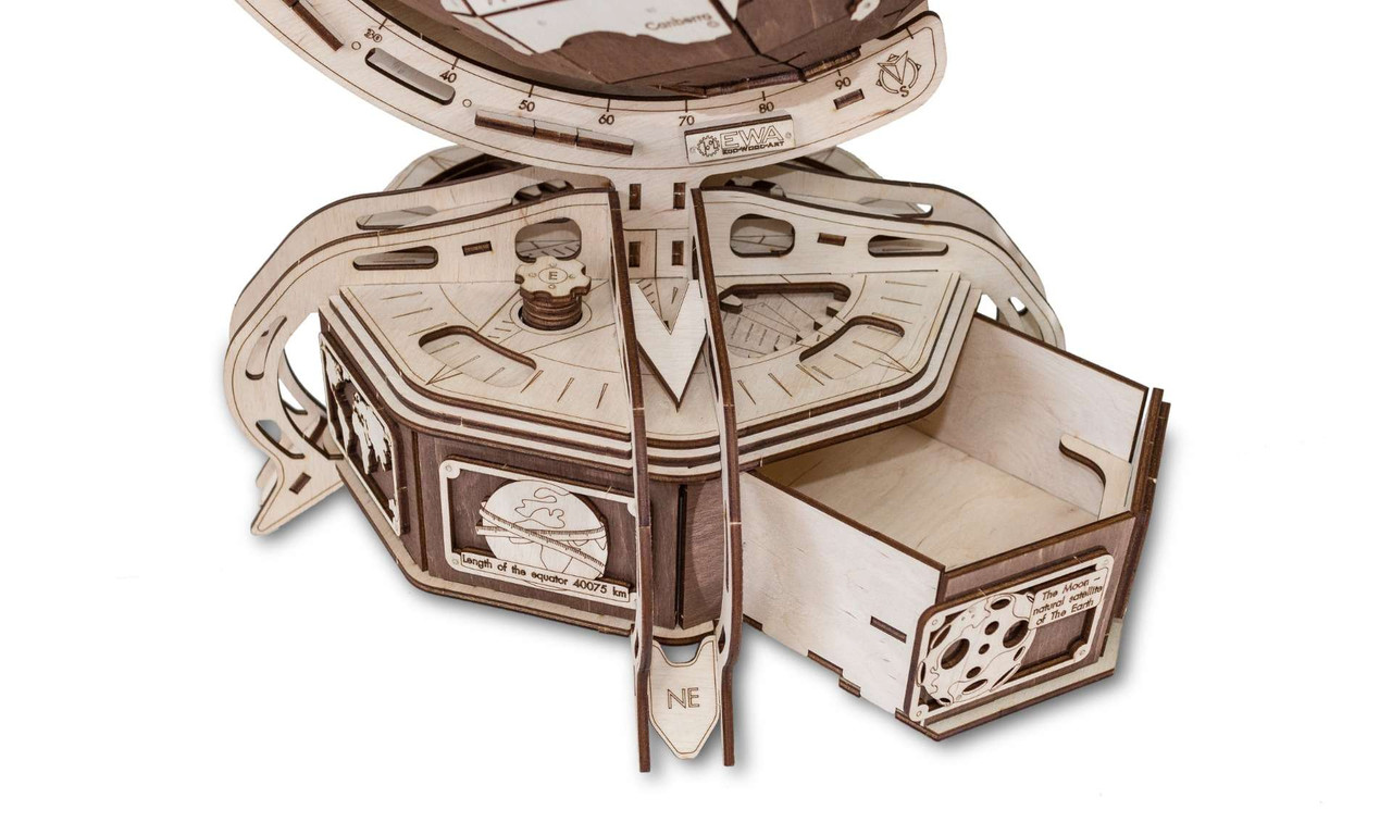 Travel the earth and discover continents and major cities. The globe rotates around its axis mounted on a beautifully decorated pedestal with facts about the earth. Discover the secret lock compartment in the base. The model is available in brown or blue.