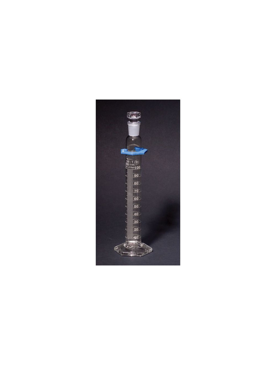 Cylinders comply with ASTM E-1272, Class A standards, batch certified. With hollow glass stopper. Double metric scale, calibrated to contain. Borosilicate glass cylinders with pour spouts feature heavy uniform wall tubing and strong, stable, hexagonal bases. All cylinders come with bumper guards.
