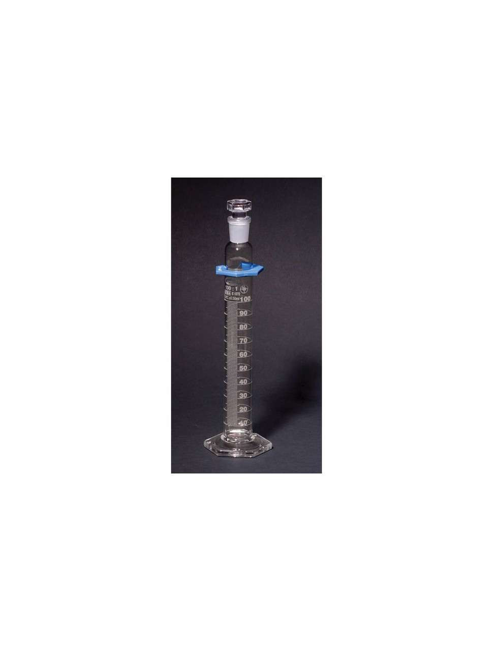 Graduated cylinder with 500ml capacity and double metric scale. Made from borosilicate glass, with heavy, uniform walls and stable hexagonal base. Hollow glass stopper and bumper guard included.
