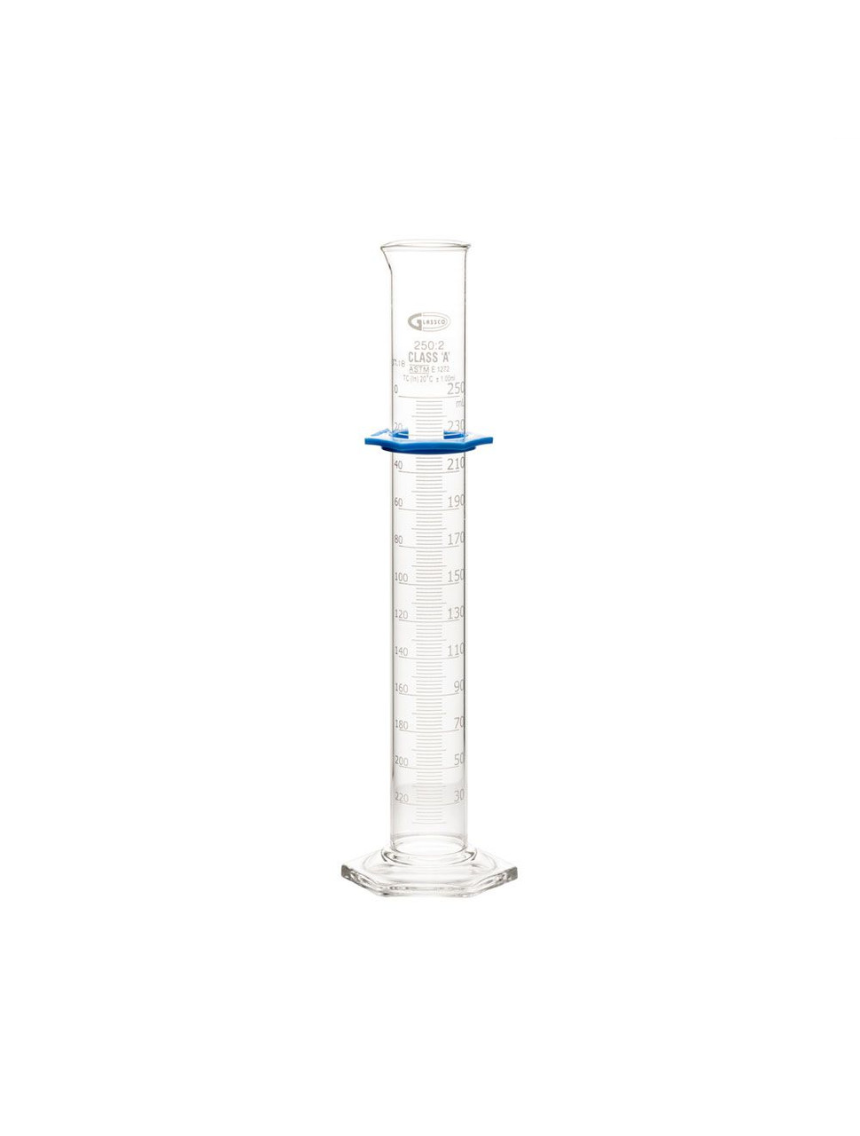 Graduated cylinder with 250ml capacity and double metric scale. Made from borosilicate glass, with pour spout, heavy, uniform walls and stable hexagonal base. Bumper guard included.