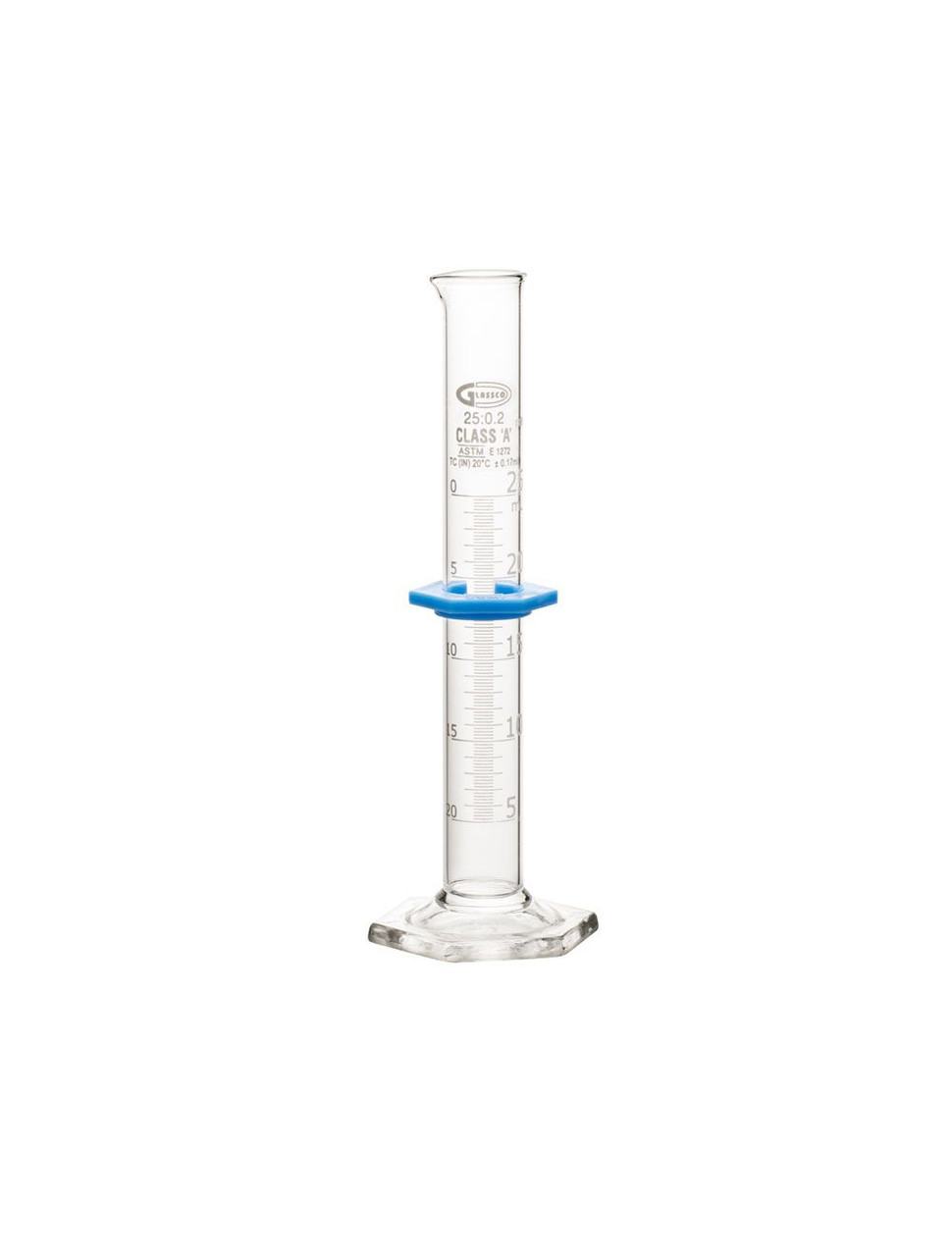 Graduated cylinder with 25ml capacity and double metric scale. Made from borosilicate glass, with pour spout, heavy, uniform walls and stable hexagonal base. Bumper guard included.