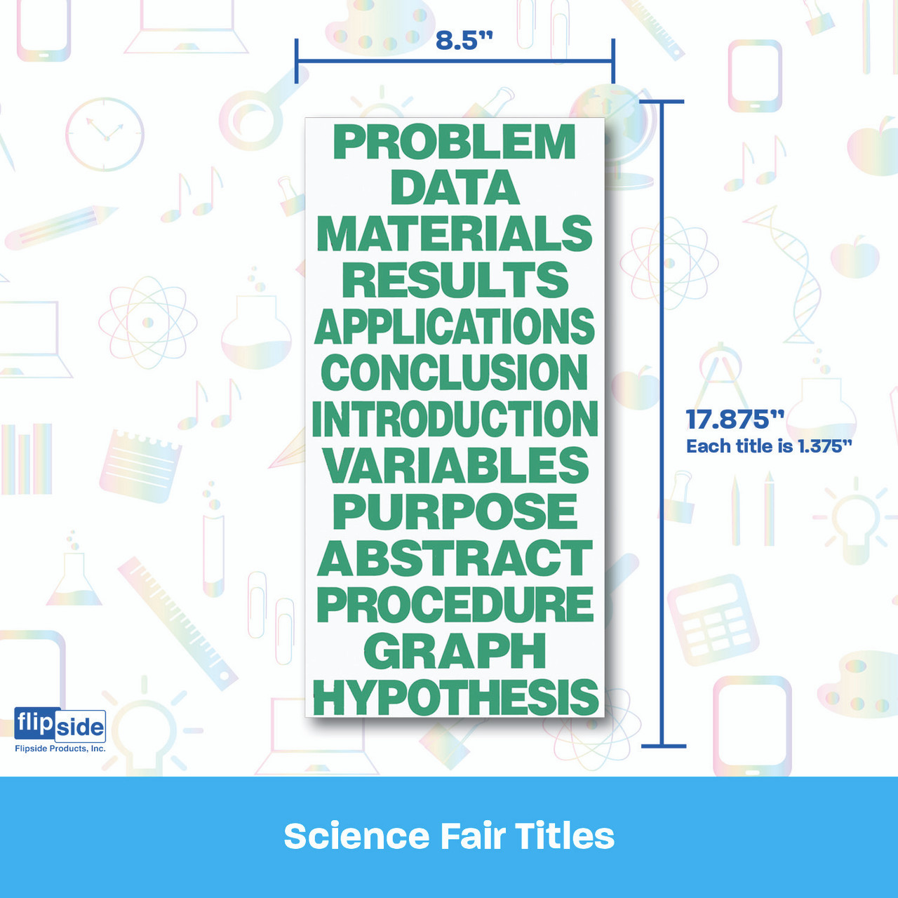 Science Fair Titles add a pop to displays and will wow teachers and judges! Printed in bold purple, all capital letters on white cardstock, titles complement our project boards to keep displays organized and complete. Each set includes the following 13 titles; Introduction, Procedure, Hypothesis, Problem, Data, Materials, Variables, Results, Application, Conclusion, Graph, Abstract and Purpose.