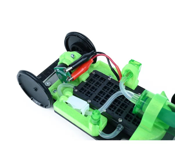 They begin by preparing things like tubing, the hydrogen tank, battery pack and the electrolyzer. Once these are in place students can create their very own hydrogen and use this to generate electricity to power the car's motor.