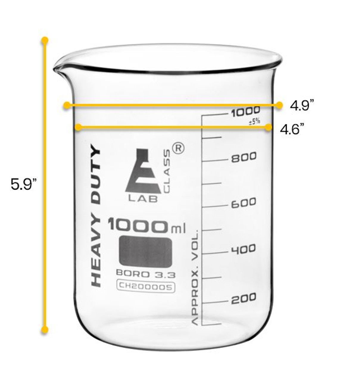 Beaker measures 5.9" tall and 4.9" wide. Inner diameter of beaker measures 4.6". Eisco Labs Borosilicate glass has the following heat tolerances: Strain Point -515°C | Annealing Point 565°C | Softening Point 820°C. Calibrated to contain. Eisco Labs proudly manufactures its own products using state-of-the-art equipment, and following the highest standards of quality control.