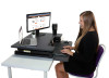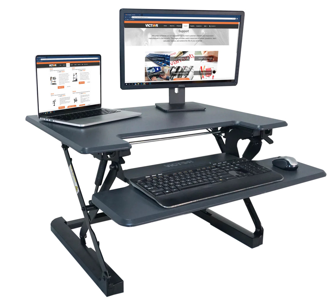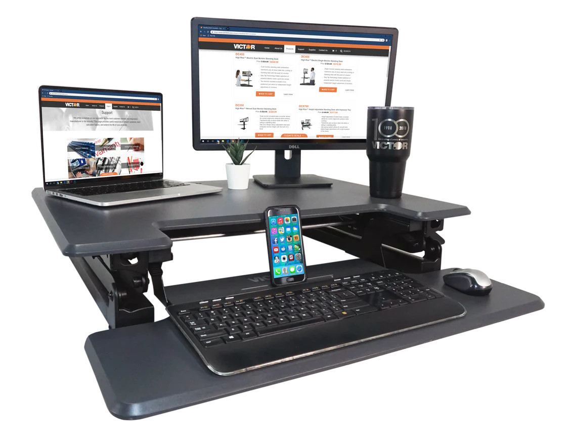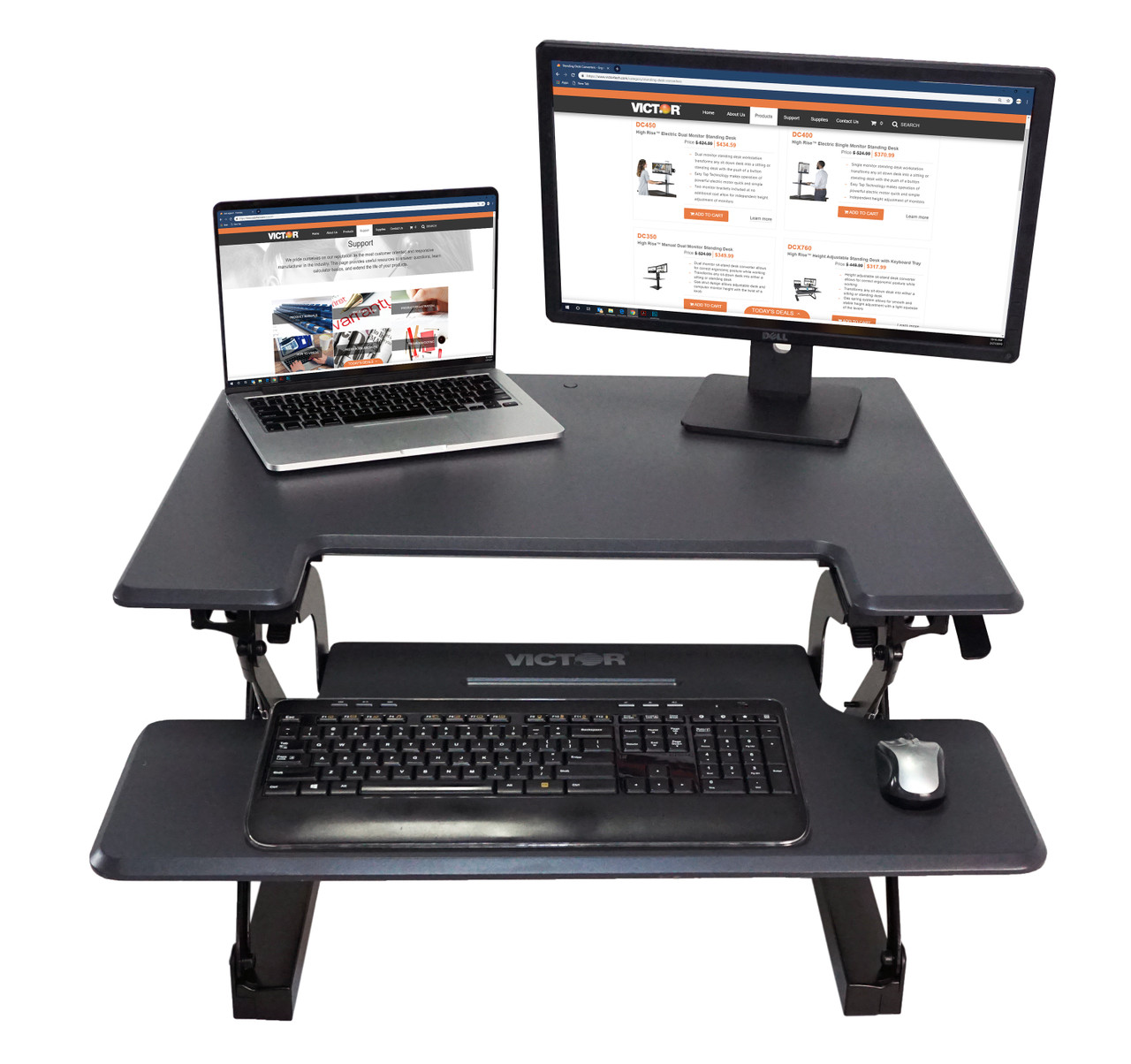 Transform any sit-down desk into a standing desk with our DCX710G model. Easily adjustable to your preferred height, this model ensures the correct ergonomic placement of monitors, keyboard, mouse, and other accessories for optimal comfort. Sleek and sturdy wood construction with a durable laminate coating provide years of use.