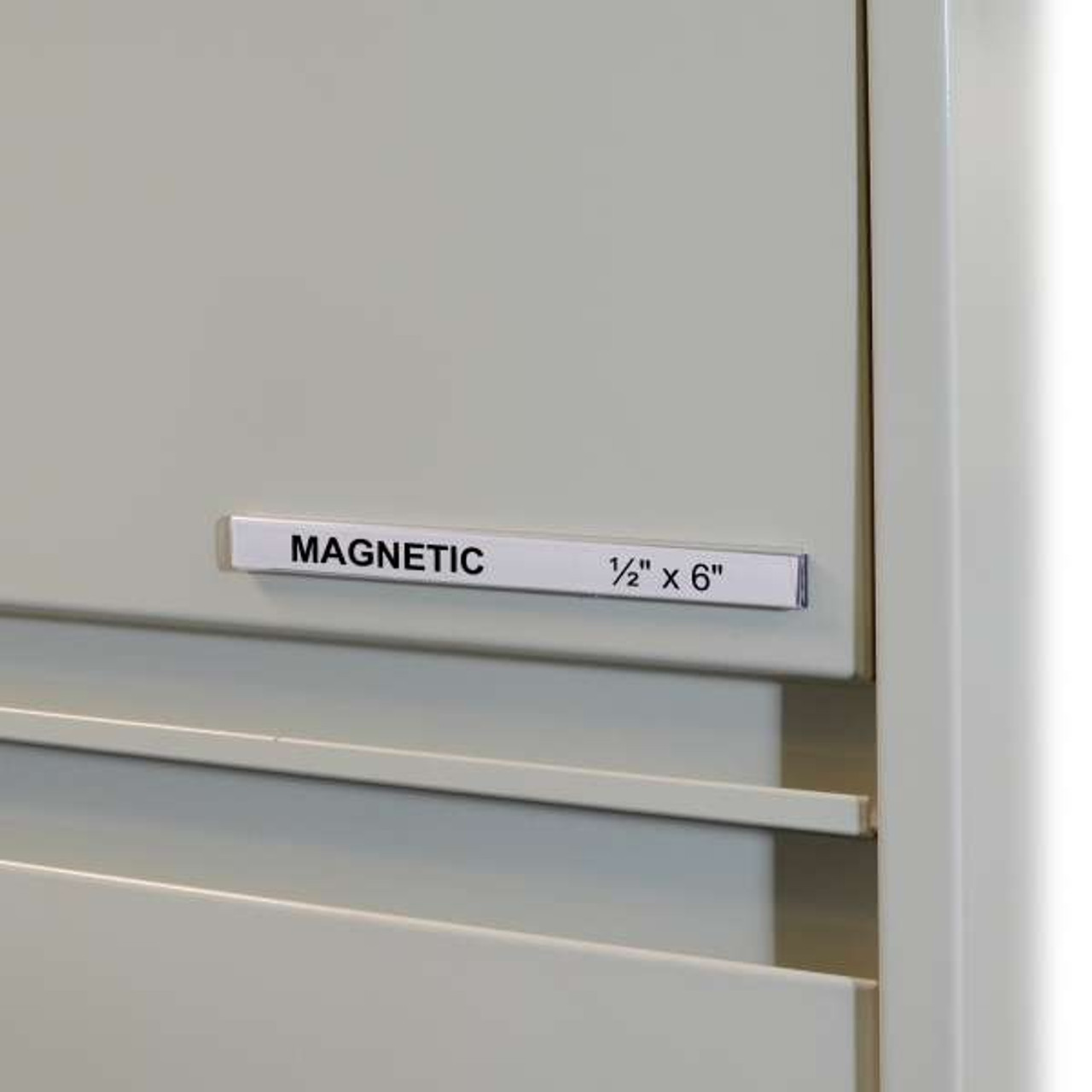 Label shelving units, racks, and more with ease and efficiency. Magnetic clear plastic holders stick to virtually any clean, flat surface. Relabeling is simple, just slide in a new white paper insert (included). 1/2 inch height x 6-inch length. Can be cut to any size. 10/BX.