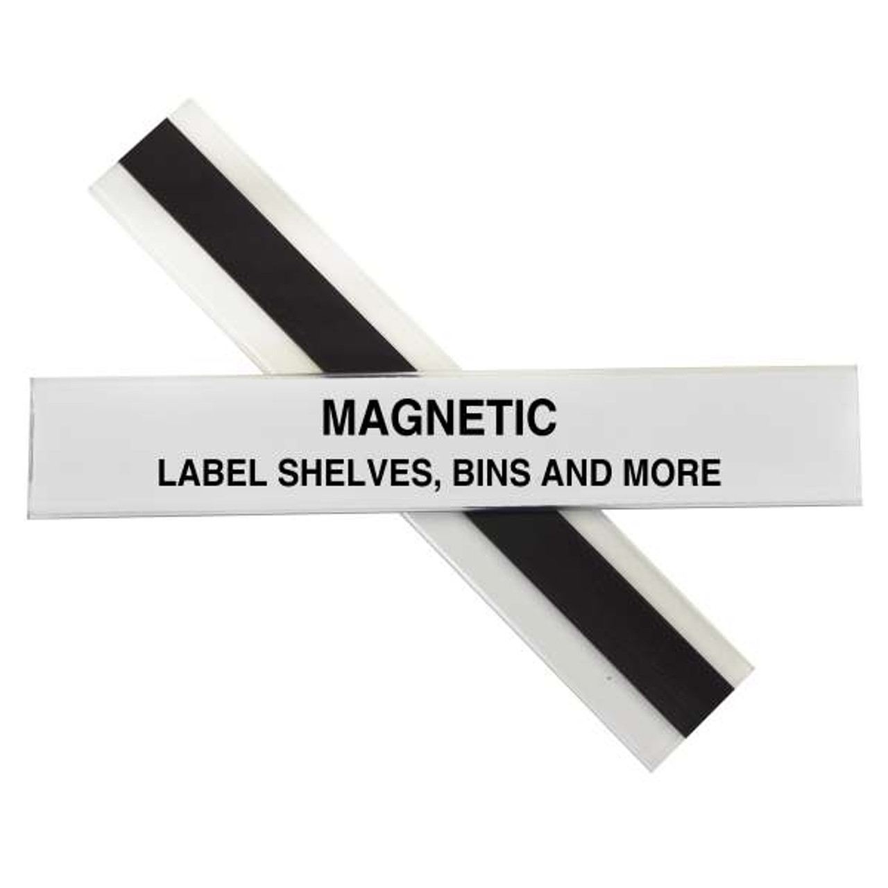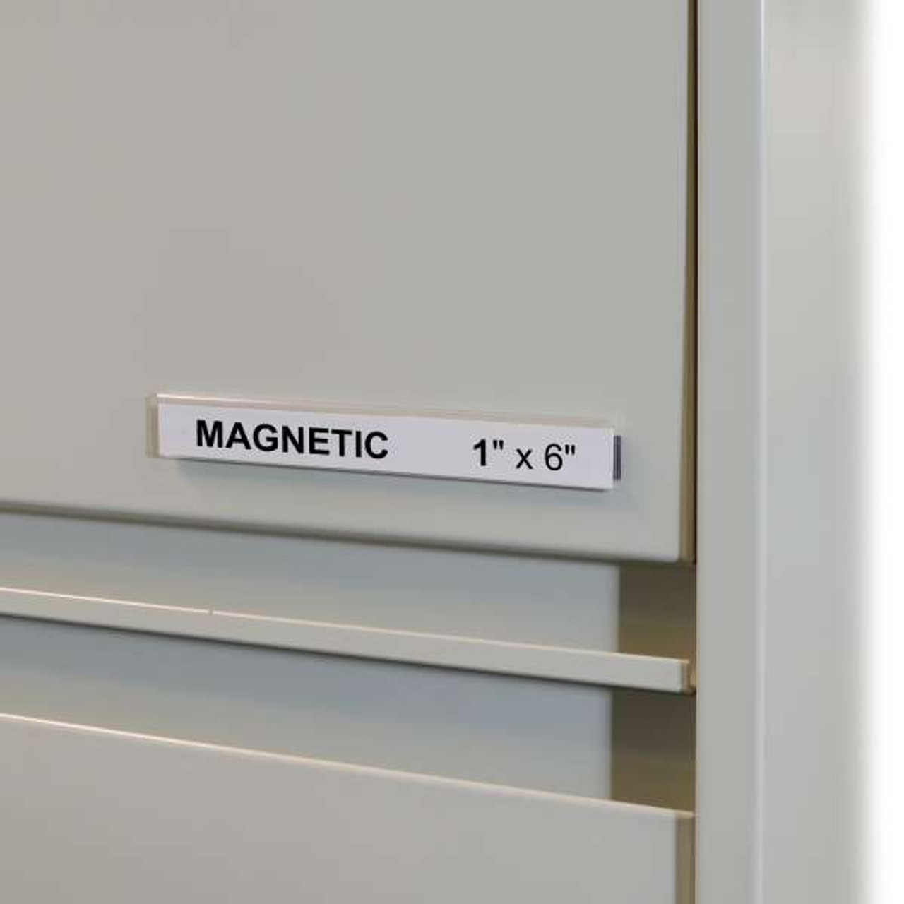 Label shelving units, racks, and more with ease and efficiency. Magnetic clear plastic holders stick to virtually any clean, flat surface. Relabeling is simple, just slide in a new white paper insert (included). 1-inch height x 6-inch length. Can be cut to any size. 10/BX.