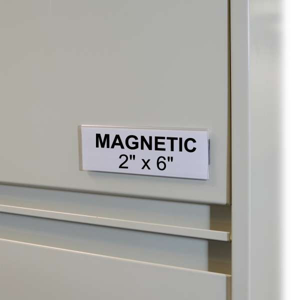 Label shelving units, racks, and more with ease and efficiency. Magnetic clear plastic holders stick to virtually any clean, flat surface. Relabeling is simple, just slide in a new white paper insert (included). 2-inch height x 6-inch length. Can be cut to any size. 10/BX.
