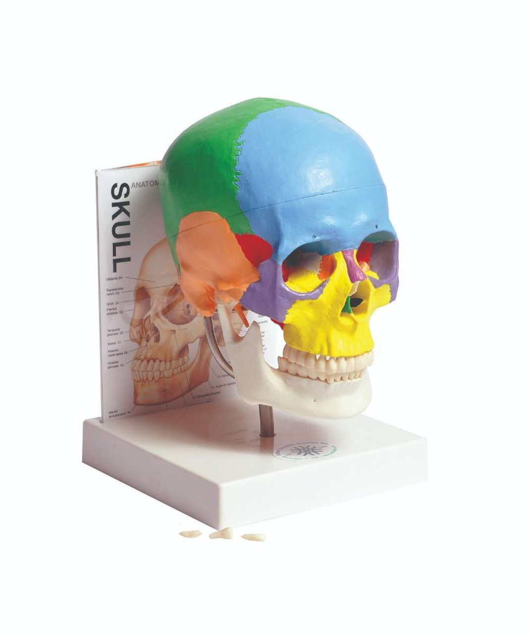 - Full-sized human skull model molded from PVC plastic, hand-painted to show anterior, internal and lateral views.