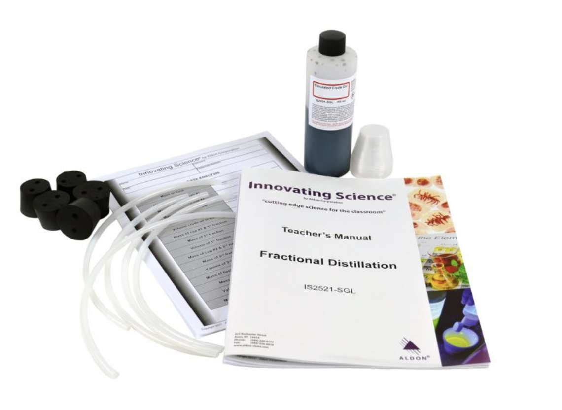 Crude oil is a complex mixture of many useful hydrocarbons such as gasoline, kerosene, butane, and motor oil. In order to be of use, these hydrocarbons must first be separated from each other. In this activity, students will complete a fractional distillation experiment to simulate the fractionation of crude oil. Topics such as boiling and condensation points, conservation of matter, and forces between molecules are covered as they factor into how a distillation is performed. This kit contains enough material for 5 groups. Teacher's Manual and Student Study Guide copymasters are included.