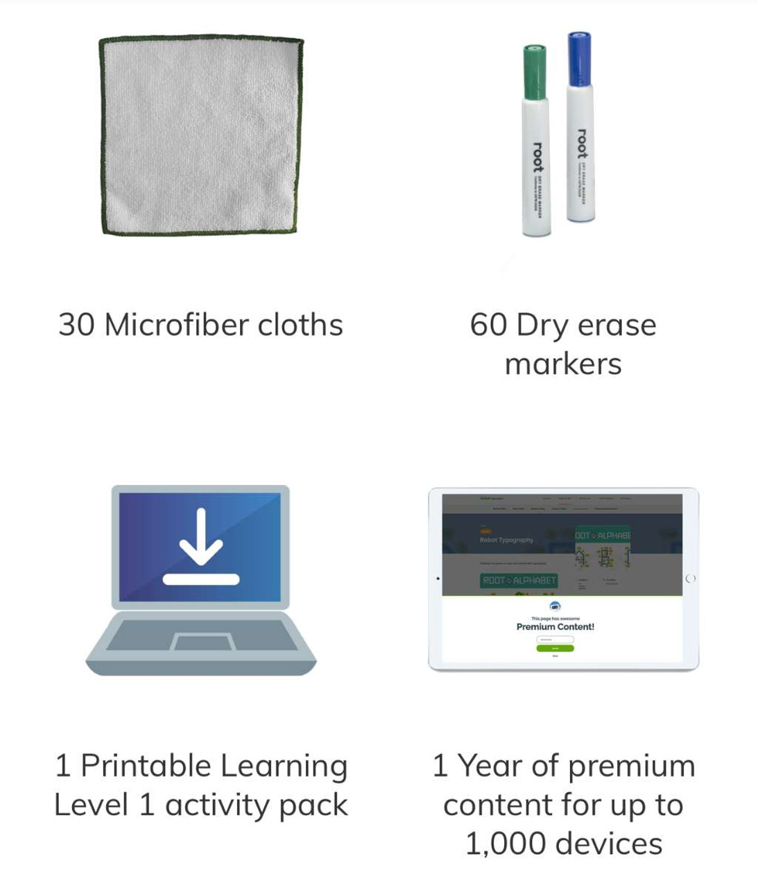 Designed for 1:1 learning environments prioritizing coding and robotics, the Root® School pack includes 30 Root® rt1 Robots, 30 fold-out whiteboard grids, 60 dry erase markers, 30 dry erase cloths, 30 sets of vinyl cling stickers, 30 chargers, a printable Learning Level 1 curriculum guide and a 1-year subscription to premium content for up to 1,000 devices.
