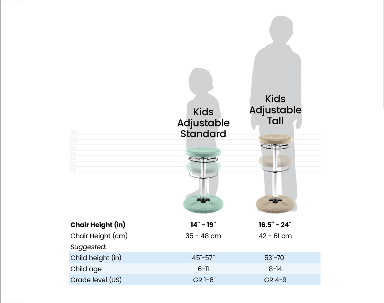 The innovative Kore Design™ Wobble Chair with it's gently-rounded bottom encourages active sitting and allows one's knees, hips and back to find comfortable and ever-changing positions; continuous movement increases Secondary Focus. Great for younger children, the seating height can be easily adjusted with the 360˚ Actuator Ring to grow with your child. Suggested for ages 6-11; Grade 1-6; child height 45”-57”.