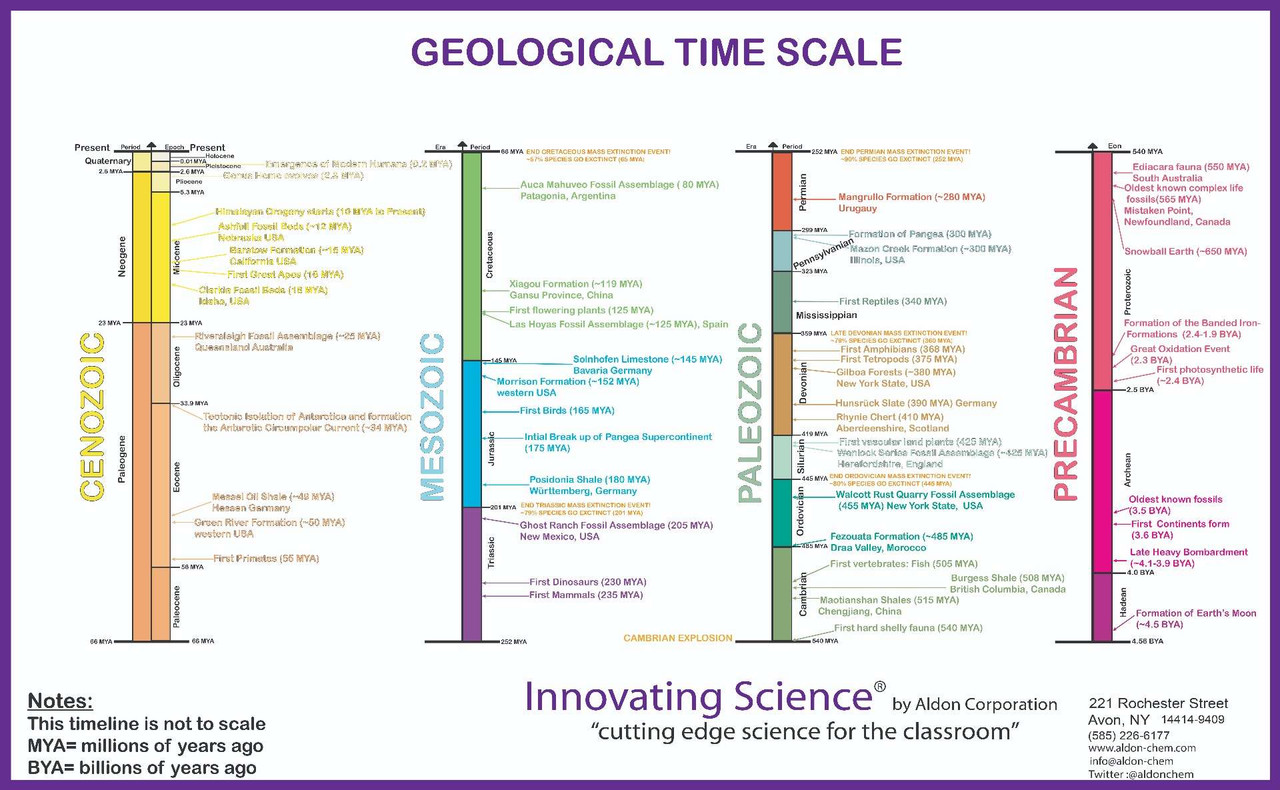 - The innovating Science Geological Time Scale shows major evolutionary events from 4.5 Billion Years Ago to present.