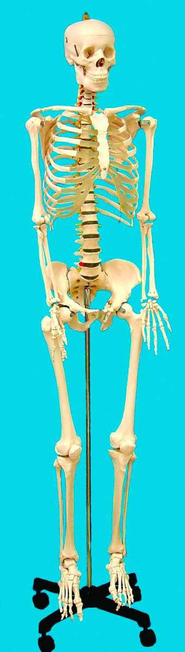 This life-sized model features unbreakable plastic bones which were carefully cast to preserve the finest details. The mandible is hinged; the arms, legs, and skull are removable; and the calvarium is sectioned to allow for the study of the cranial vault. There is natural movement in the joints wherever possible. The jaw features a full set of teeth, three of which are removable for closer examination. The spinal column shows the spinal cord, nerve exits, vertebral arteries, and a herniated disk. The skeleton is mounted in an upright position on a heavy-duty base with smooth gliding casters. A dust cover and detailed key are included. Height: 170cm (5 ft., 7 in.).