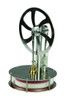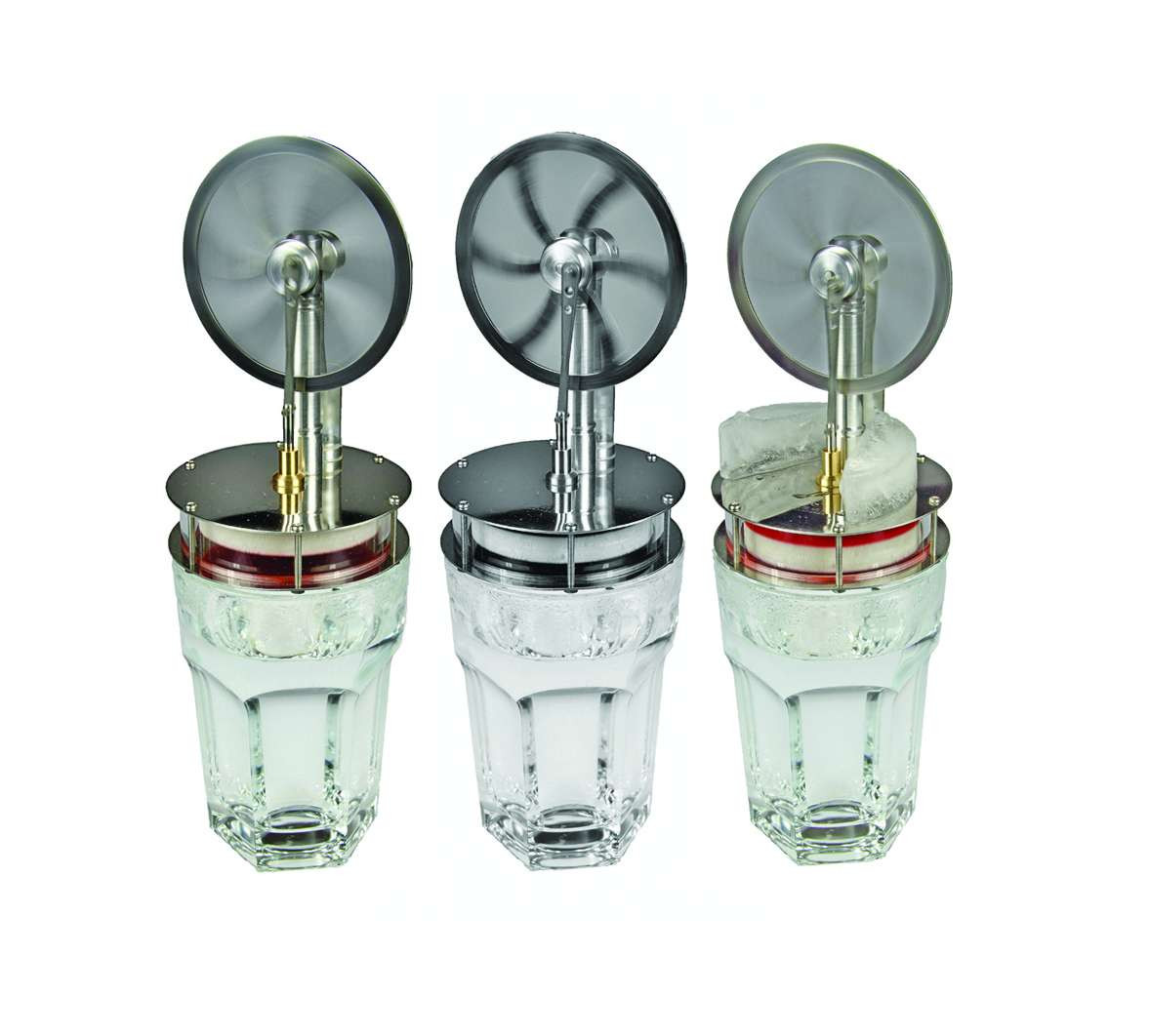 This economical Stirling Engine runs by exploiting the heat flow generated by the small temperature difference between room temperature and a cup of hot water or ice.