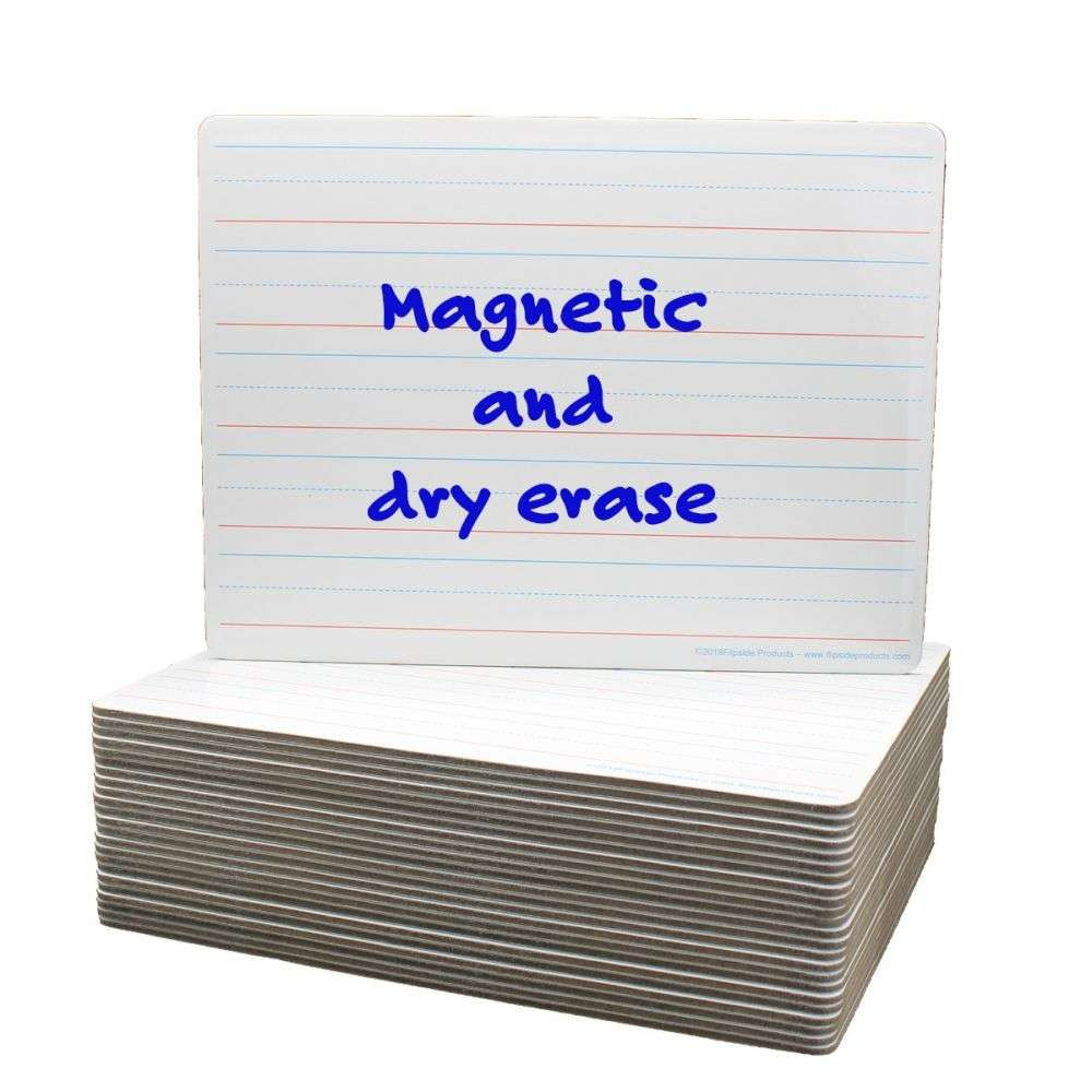 The class pack of magnetic 9" x 12" red and blue ruled two-sided dry erase board serves as an excellent tool for learning to write, providing several benefits. The red and blue lines on one side help learners develop proper letter sizing and spacing, reinforcing fundamental writing skills. The dual-colored lines can assist in distinguishing between different writing zones, promoting better organization. The blank backside allows for free-form practice, fostering creativity and flexibility in writing exercises. Additionally, the dry erase feature facilitates repetitive practice, making it an eco-friendly and reusable resource for honing handwriting skills. In addition to its writing benefits, the magnetic feature allows for the attachment of visual aids, such as letters, numbers, or other educational magnets, enhancing interactive learning experiences. This versatility makes the board an engaging tool for teaching various subjects, including math and language skills. The combination of ruled lines and magnetic capabilities makes it a multifaceted learning aid that promotes both structured writing practice and interactive, hands-on learning. 24 Pack.
