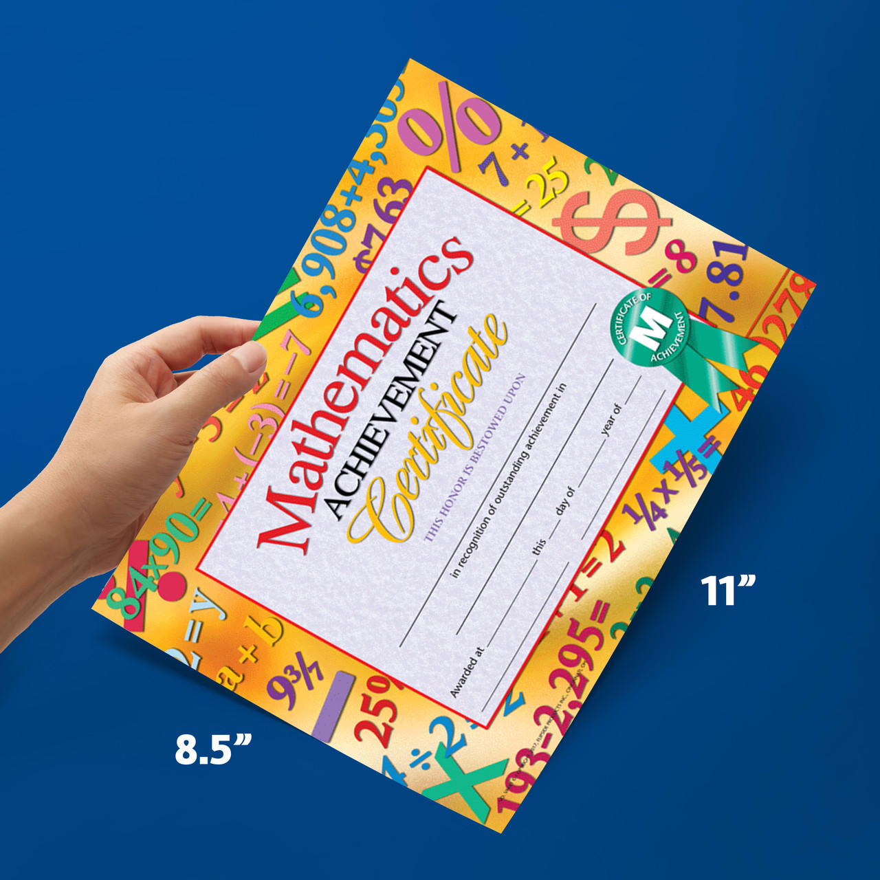 Math Achievement Certificate features a bright orange background with different math symbols scattered throughout the background. These beautifully designed Hayes certificates are a great way to reward students who have been excelling in math. Teachers and administrators can give these achievement certificates out at award ceremonies and end of the year parties. These student certificates also work great as classroom incentives. They are printed in full color on high quality paper. Certificate reads: Mathematics Achievement Certificate This Honor Is Bestowed Upon _____ in recognition of outstanding achievement in _____ Awarded at _____ this _____ day of _____ year of _____. This math achievement award can be personalized with the student's name and other information pertaining to the award. They can be completed by handwriting the information or printing it. Downloadable template available. Inkjet or laser printer compatible Certificates measure 8.5" x 11" 30 per pack Eco-friendly High quality matte certificates Best Seller