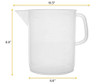 5000ml capacity measuring jug, made of with high quality polypropylene plastic. Short form, Euro design. Jug features excellent optical clarity and easy to read, raised graduations and specifications. 250ml subdivisions. Features a spout for easy pouring, and handle for stable handling and convenient lifting. Jug measures 8.9" tall, and is 10.5" wide from spout to handle edge. Bottom diameter measures 6.6".
