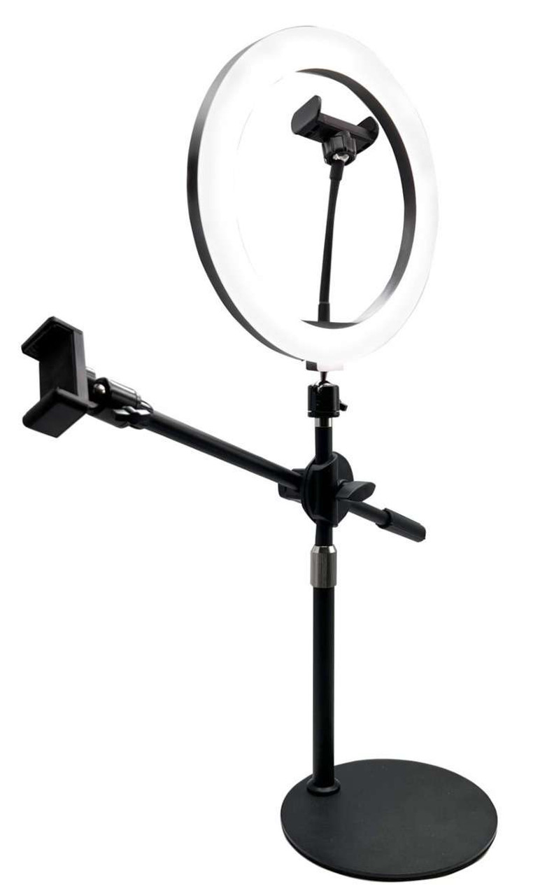 This 10'' LED Ring Light features an extendable stand base, lavalier microphone, and dual phone holders for Live Stream/Makeup/YouTube Video/TikTok (compatible with all phones). Designed to maximize the clarity and visibility of your subject, it is ideal for portable, office, school, and/or studio use. The stand is sturdy and easily adjusted, and the lavalier microphone delivers quality sound for all needs!