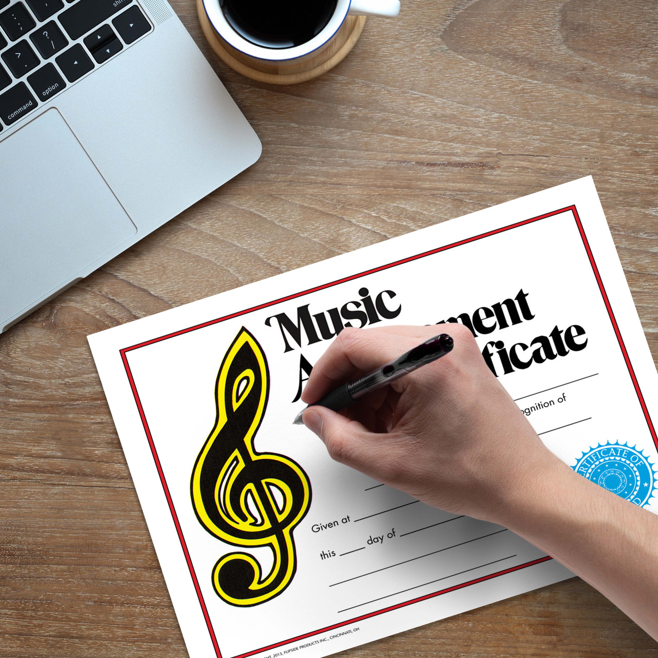 Music Achievement Certificate features a classic Hayes styled student certificate. This achievement certificate is printed in full color on high quality paper. The certificate features a black music note with a yellow and black outline. Great to give out at end of the year parties and award ceremonies.