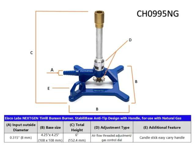 - Natural Gas Tirrill Bunsen Burner, StabiliBaseTM Anti-Tip Design with Handle