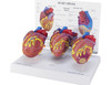 Normal heart anatomy; myocardial infarction heart demonstrating a partially healed, thinned, and discolored infarcted area. Including a thrombus in the apex of the heart; and a heart demonstrating congestive heart failure as a result of hypertension. The left ventricle hypertrophy and the correspondingly enlarged and distorted shape of the heart is shown both internally and externally. All models are approximately 50% actual size. Model sizes: Normal & MI 4” x 2-1/4” x 1-3/4” CHF 4” x 2-1/2” x 2-1/4”