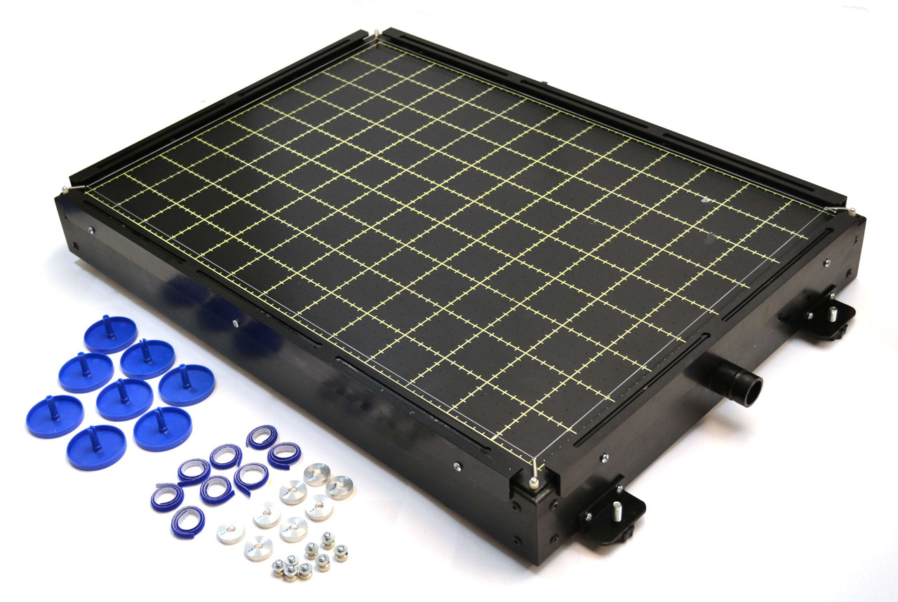 • Air table is constructed of heavy gauge anodized steel, the workable surface is 65cm by 45cm with major graduation of 5 cm and minor graduations of 1 cm
