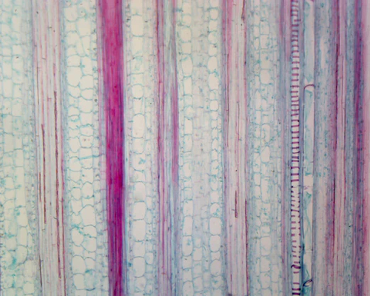 This item is a prepared microscope slide with specimen. It is a longitudinal section of a stem from a zea mays plant (corn). The glass slide is 1 x 3 inches with a glass coverslip. The mounting medium is clear. The specimen is of a good quality and well stained.