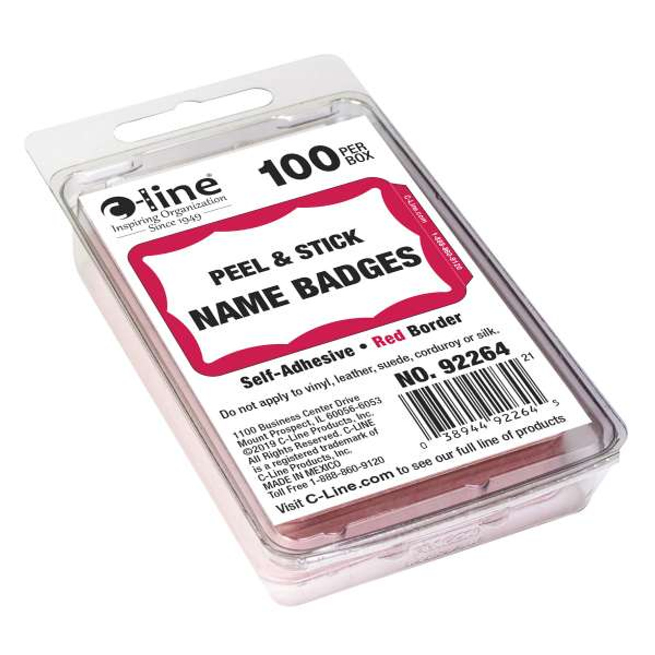 Ideal for small meetings, seminars, and conferences. Unique tabbed edge makes it easy to peel off backing paper and apply. Overall badge size: 3 1/2 x 2 1/4. Do not apply to vinyl, leather, suede, corduroy, or silk. Border Badge. Red. 100/BX.