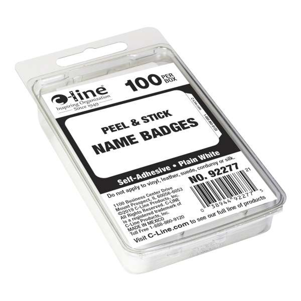 Ideal for small meetings, seminars, and conferences. Unique tabbed edge makes it easy to peel off backing paper and apply. Overall badge size: 3 1/2 x 2 1/4. Do not apply to vinyl, leather, suede, corduroy, or silk. Border badge. White. Plain. 100/BX.