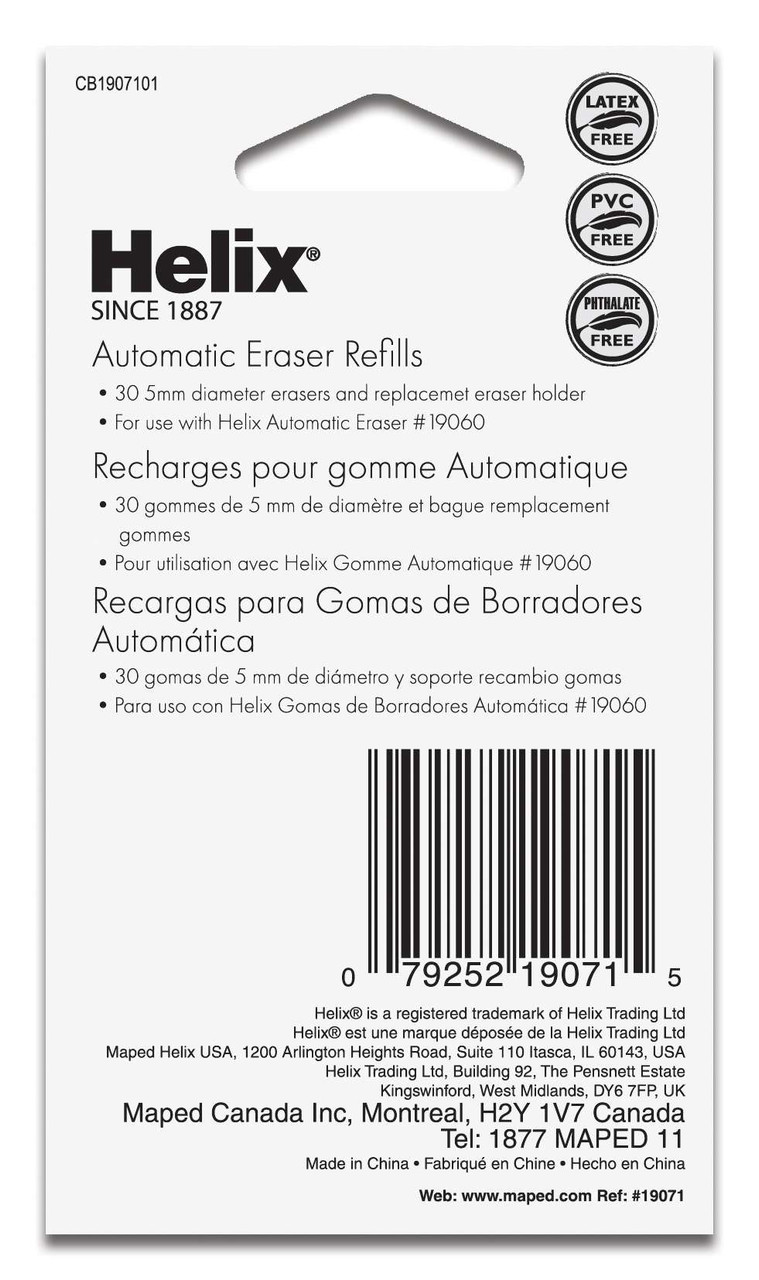 Perfect for artists, architects or anyone who needs help erasing, this 30 pack of super-soft eraser refills are the perfect way to extend the lifespan of your Helix Professional Eraser. Please note that the Helix Professional Hi-Polymer Automatic Battery Powered Eraser Refills work ONLY with Helix item 19060, our Automatic Battery Powered Eraser. The small eraser nub is great for removing small details, and are PVC, Latex & Phthalate free! 30 pack comes with one additional replacement collar for use with Helix Automatic Battery Powered Eraser.
