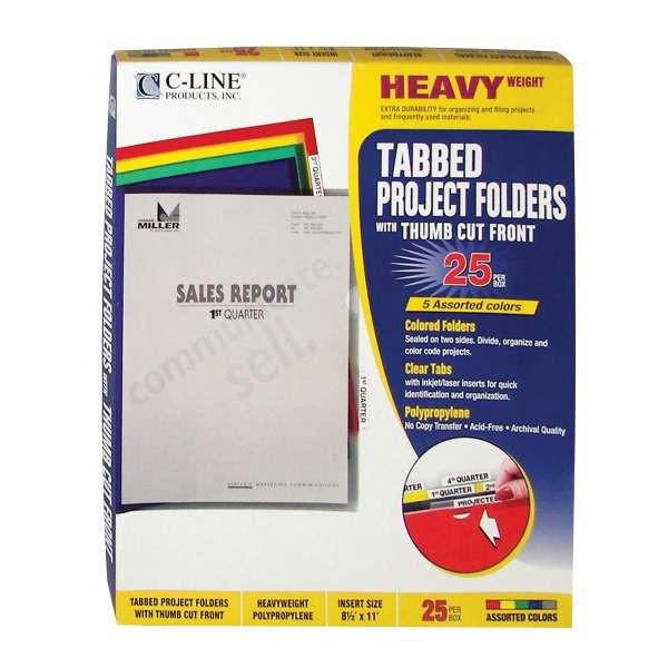The folders come in an assortment of bright colors, which help to separate your many projects and activities. The durable polypropylene material preserves documents' original state. Quickly find the information you are looking for in your files. Polypropylene folders are sealed on two sides and feature clear index tabs on the back for quick identification and filing. 5 each - red, yellow, green, blue, and smoke. 25/BX
