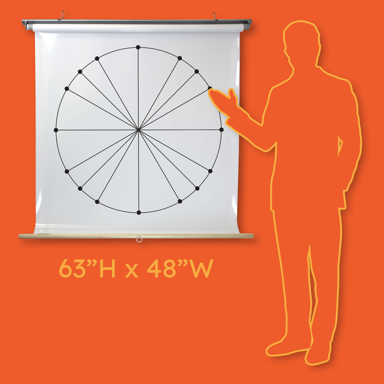 Our exclusive, high quality, pull down dry erase chart hangs anywhere you need it! This Unit Circle, like all unit cirlces, has a radius of one. The perfect demonstration tool for small groups or the entire class. The spring-loaded roller allows for multiple fixed positions and will retract completely when you pull down on the ring. Chart has hanging chains and track. This pull down whiteboard can be hung from the top of a chalkboard or wall. Chart measures 48"L x 63"H.