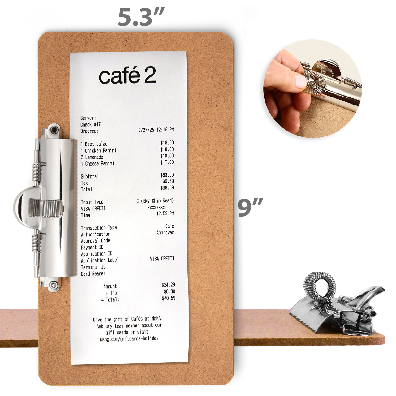 - Made in the USA! High quality clipboard with low profile metal side clip, perfect for high volume restaurants, bars, and other hospitality establishments