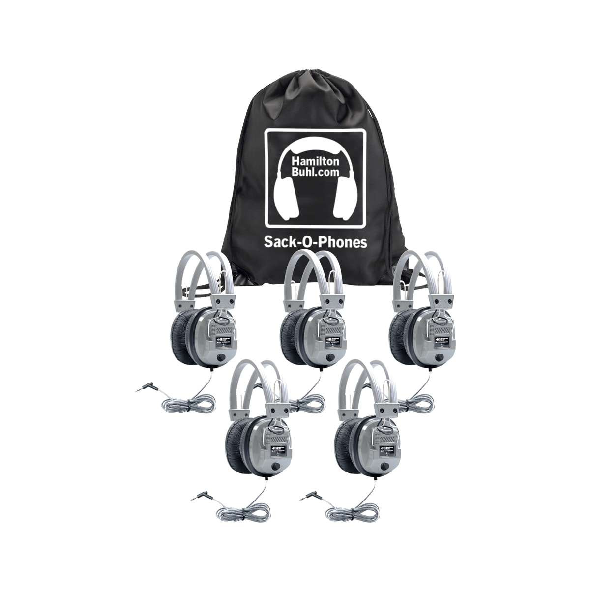 This 5-Pack of HamiltonBuhl® SC7V Deluxe-Sized Headphones feature Leatherette Ear Cushions and a Volume Control on-ear cup. Sack-O-Phones packaging is a unique bag that doubles as a knapsack and holds 5 deluxe or 10 personal headphones. It's a great way to store headphones easily and economically, no need for costly plastic cases for storage.