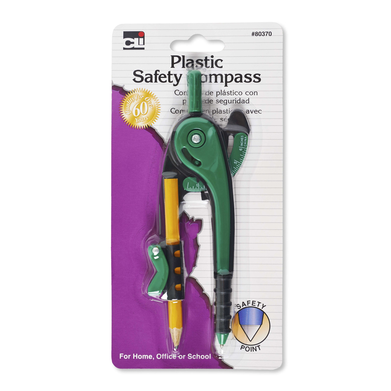 Perfect for school or home use, this set includes 1 Ball Bearing compass and swing arm protractor. The safety compass which creates accurate circles up to 12 inches in diameter, features a positive Pencil lock. It comes complete with Pencil, inch and centimeter guide. The 6 inch swing arm plastic protractor has an open center, sharply defined graduations and is complete with a 6 inch ruler.