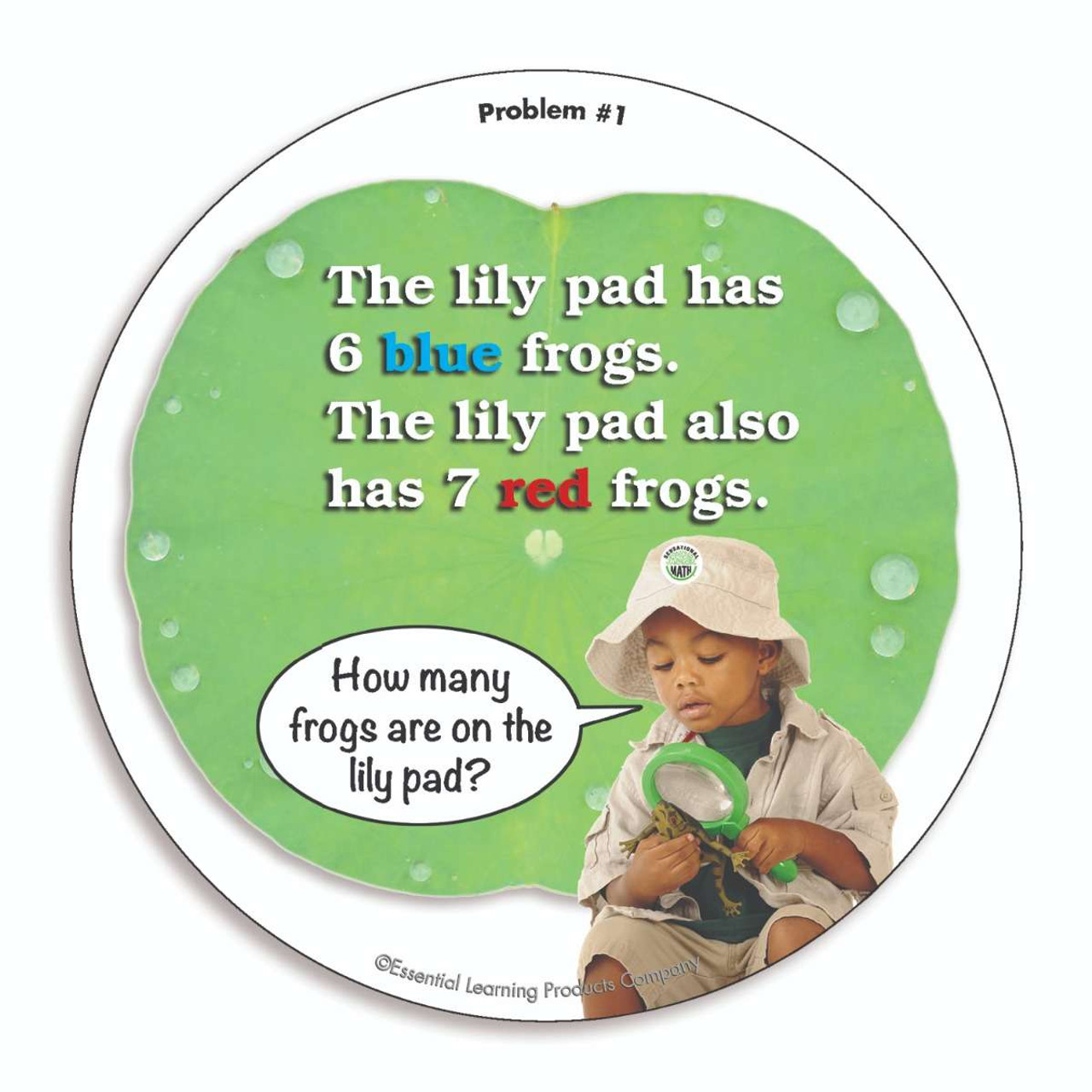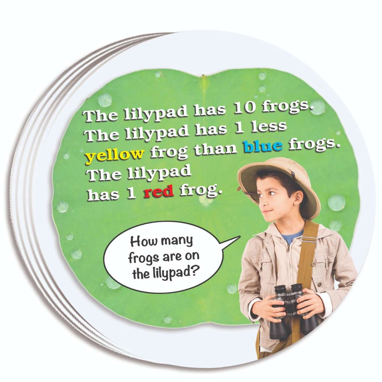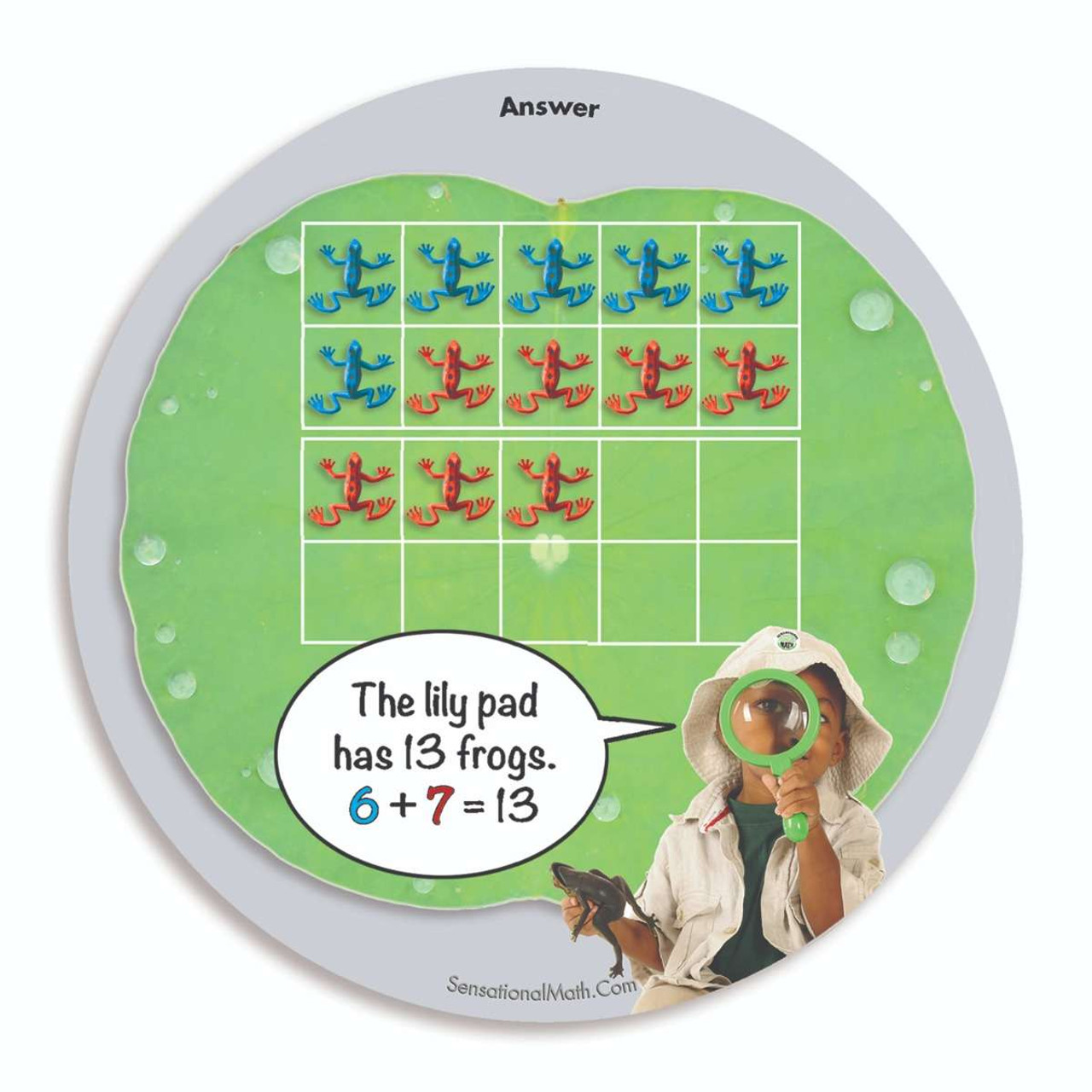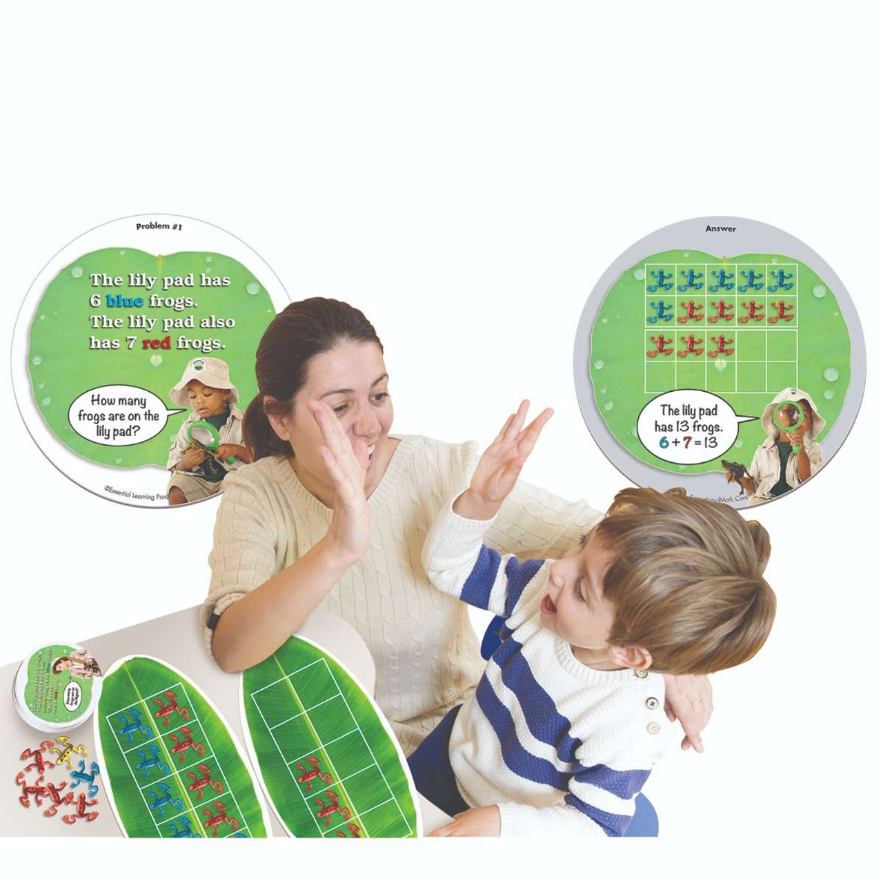 Students will have a "hopping good time" discovering addition & subtraction facts to 20 with this set of 40 full-color, photo-realistic 5.25" Problem-Solving Cards, 2 leaf motif 13" Ten-Frame activity mats and 45 large & colorful plastic frog manipulatives. (15 each red, yellow & blue) Students simply use the information provided on the nature-themed problem-solving cards to place Froggy manipulatives on the Ten-Frame "Leaf" cards. They will quickly be able to subitize or count the Froggy counters to determine the correct answer. The answer side of the problem-solving card will present the visual match to self-check Froggy manipulatives on their Ten-Frame Leaves. The card also states the numeric answer and introduces the equation in a color-coded format. Students will soon "see the operations" of sums and differences to 20 through these visual and hands-on activities! You can easily expand this set into multiple centers or whole class activities with Ten Frame Leaves & Froggy Went a Countin' sets of 75 or 300 sold separately.