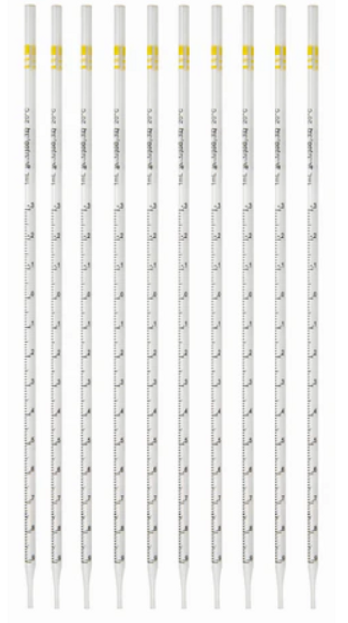 The Serological Pipettes are used to transfer liquids in a laboratory. The sterile serological pipettes are individually packaged. They have a capacity of 1ml and are graduated by 0.01ml. They are plastic and graduated in black and have a color-coded band at the top for easy identification.