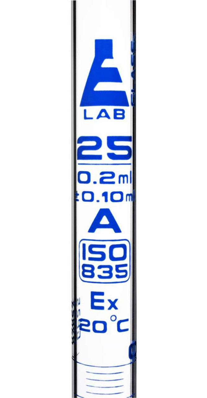 Serological pipette made of high quality, heavy duty Borosilicate 3.3 glass. 25ml capacity, 0.2ml blue graduation lines, marked every 2ml. Class A, tolerance, ±0.100ml . Calibrated for delivery to jet.