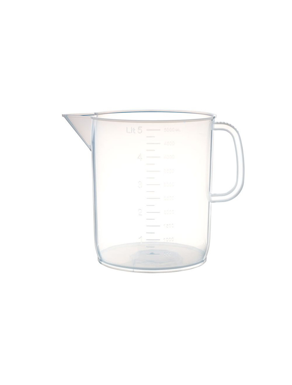Set of five short-form polypropylene beakers: one each with 500ml, 1000ml, 2000ml, 3000ml and 5000ml capacity. Beakers include pour spout, comfortable rectangular handle and easy-to-read printed graduations. Autoclavable.