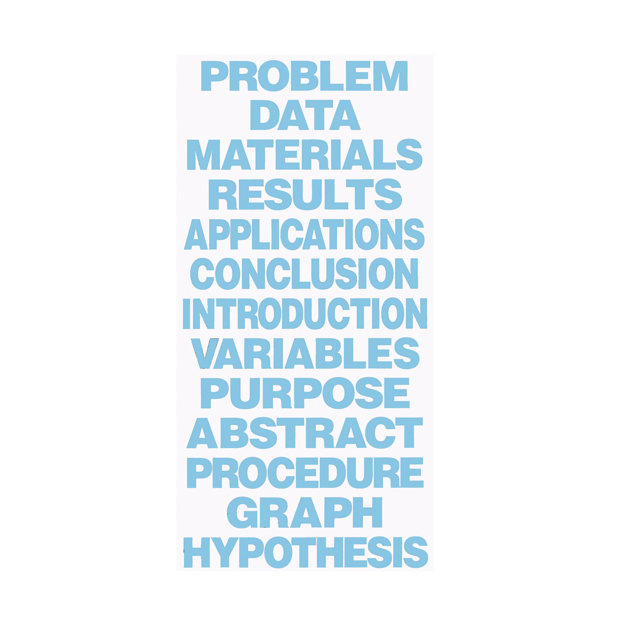 - Most Common Science Terms - Problem, Data, Materials, Results, Applications, Conclusion, Intorduction, Variables, Purpose, Abstract, Procedure, Graph, Hypothesis