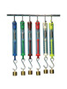These color-coded spring scales feature a clear plastic tubular design, a suspension ring, and an oversized load hook. A zero adjustment screw is provided at the top. Overall length is approximately 7".