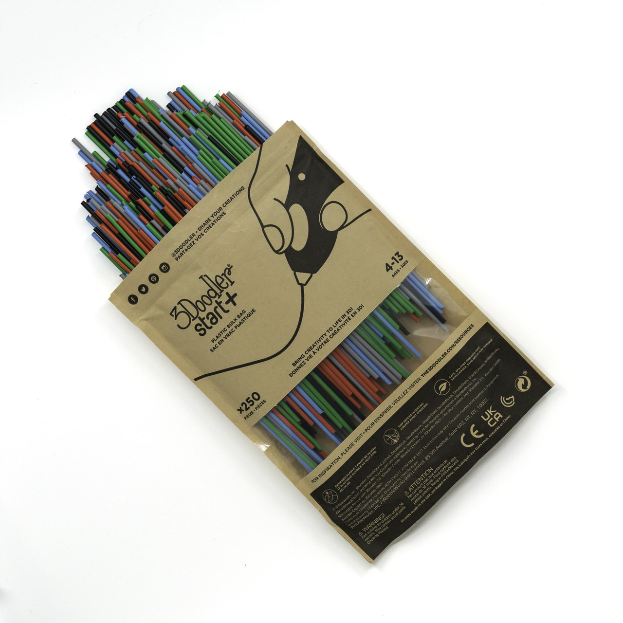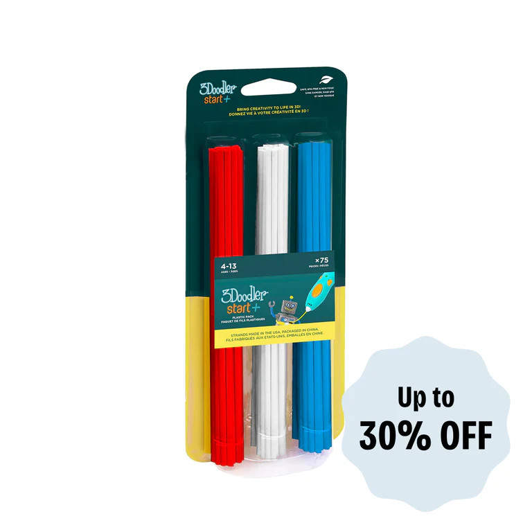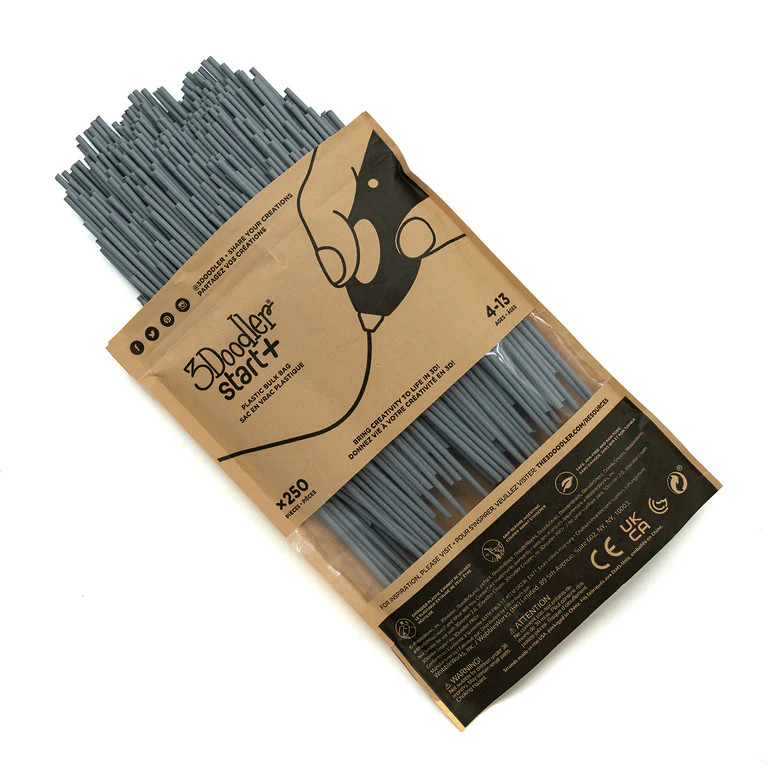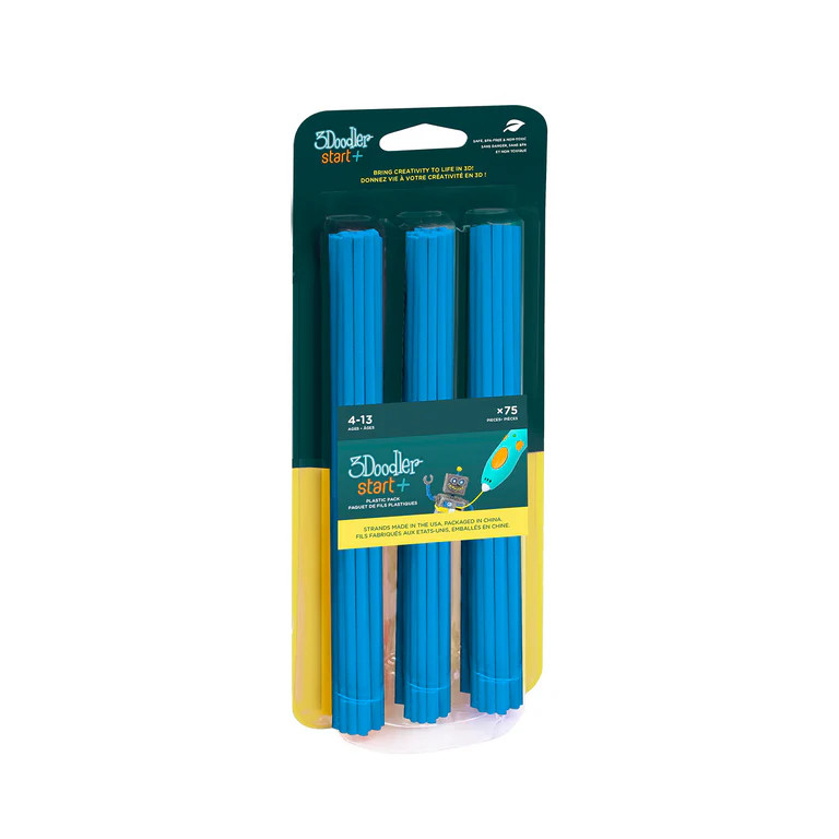Our Start / Start+ 2.5mm Eco-filaments are low-heat, BPA-free and non-toxic strands that are eco-friendly in a household compost and completely safe for kids. Safe to Doodle on almost any surface, the material can be easily removed, though will adhere firmly to some clear plastics. Each strand of material extrudes up to 6 times the original length. One six inch strand can produce over 35 inches of Doodles.