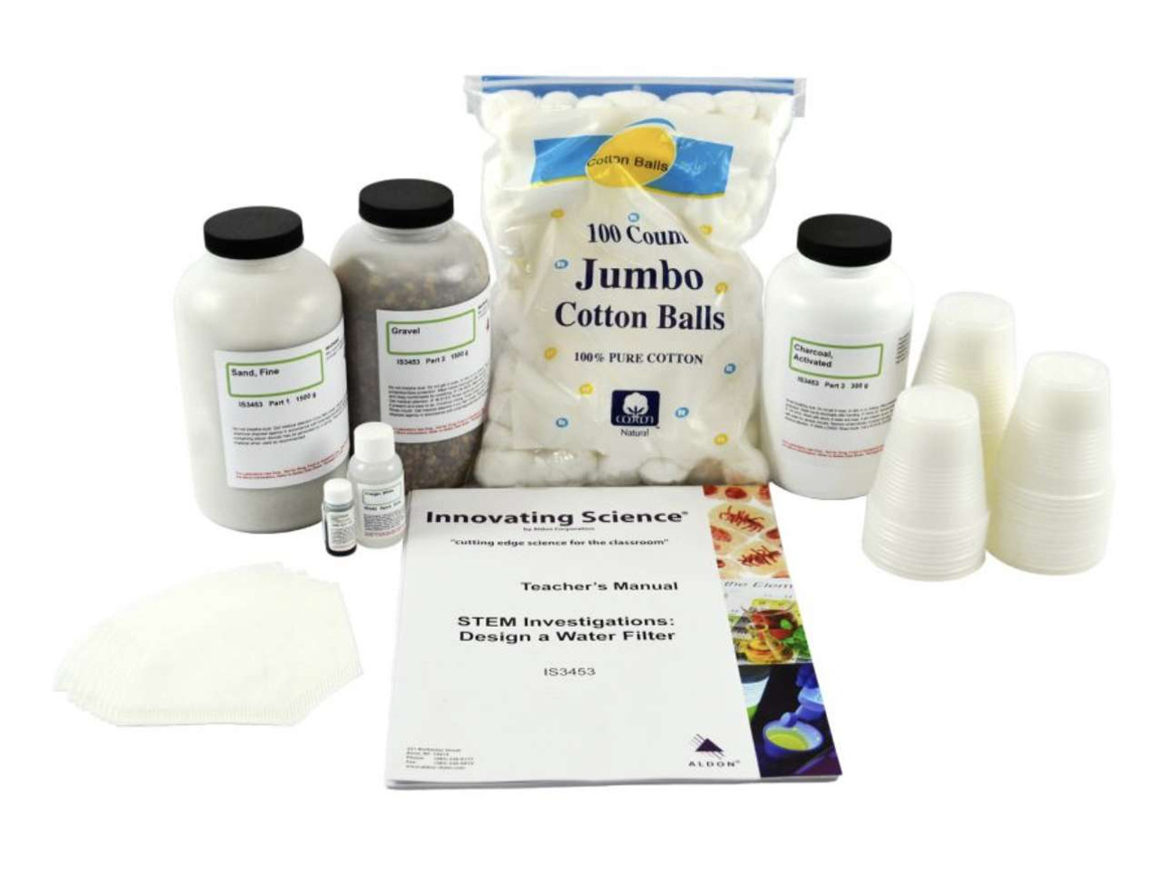 How is the water that comes out of our faucets made safe for consumption? Students will learn about the processes performed at water treatment facilities, and then engineer their own small scale filtration plant. Once they design their filtering system, they will observe and evaluate the quality of the water they produce. Kit contains enough materials for 15 groups of students. Teacher's Manual and Student Study Guide copymasters are included.
