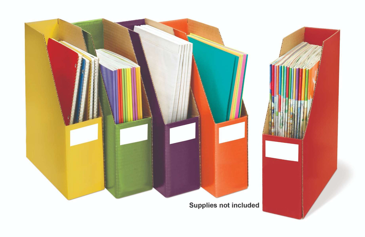 This set of five storage files are just what you need to store magazines, plan books, files, resource books, children's books, etc. Part of the Blooming Colors Collection these vibrant storage files come flat and fold up in seconds. Made of corrugated material with a nice coated finish and label area on the front panel. Ample size (12.25” high, 9” deep, and 3.5” wide) to hold the big stuff!