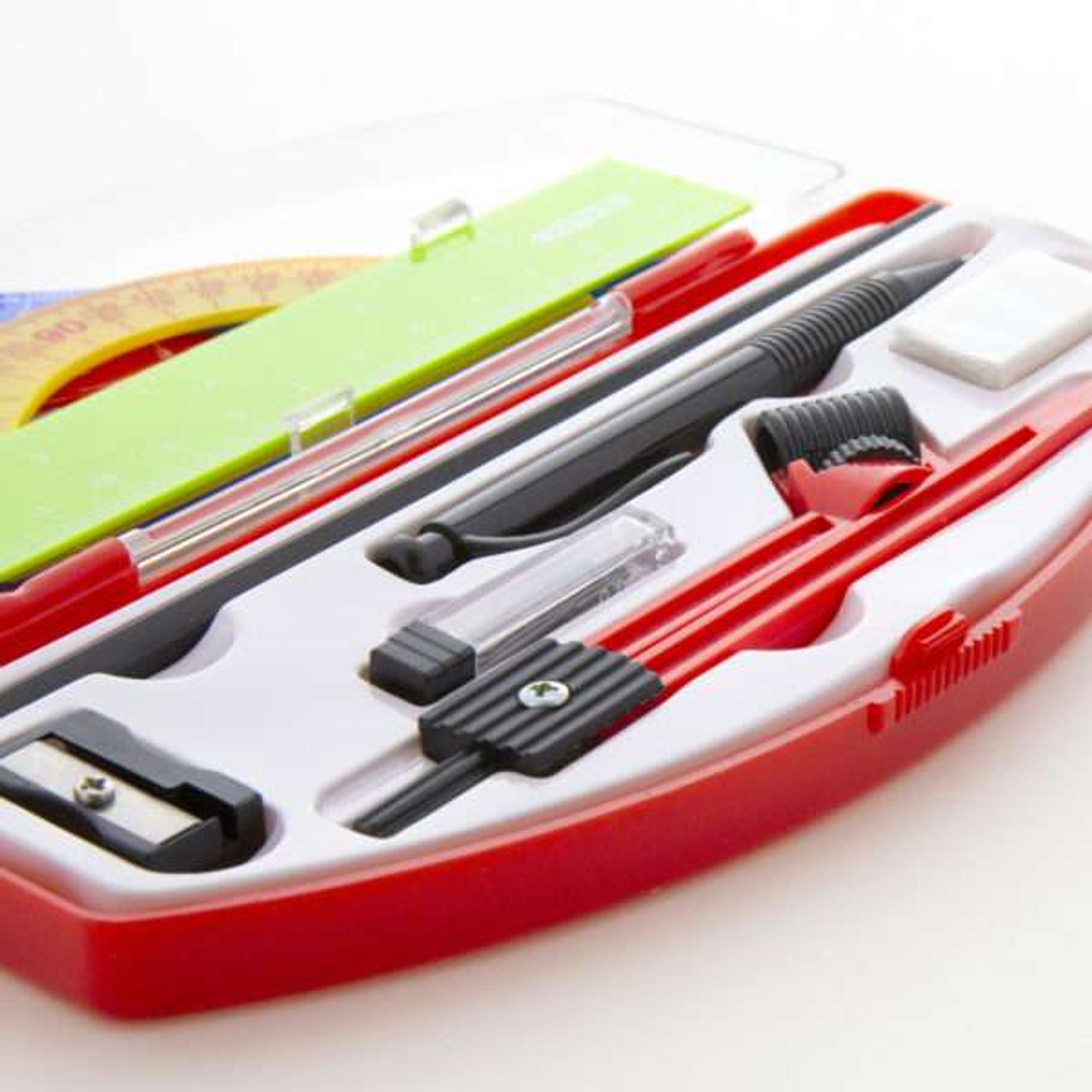 - MATH GEOMETRY KIT 11 PIECES. 180 degree semicircular protractor + Compass with 0.7 mm mechanical pencil + 30/60/90 Degree Triangle Ruler+ 45/90 Degree Triangle Rulers + Ruler 6" (15 cm) + Lead Fill + Eraser + Sharpener + Wood Pencil + Portable Transparent Case
