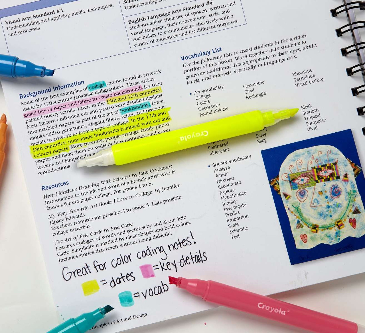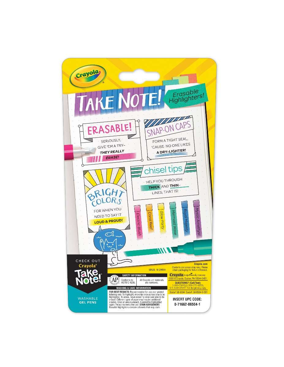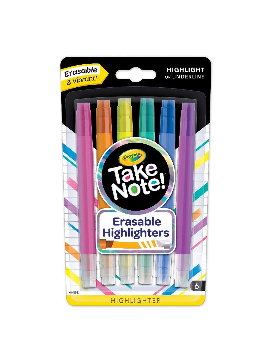 The Crayola® Take Note! Erasable Highlighters have bright colors on one end and clear ink tips on the other end for magically erasing the colorful highlights. No more worrying about highlighting the wrong word or over-highlighting a page.