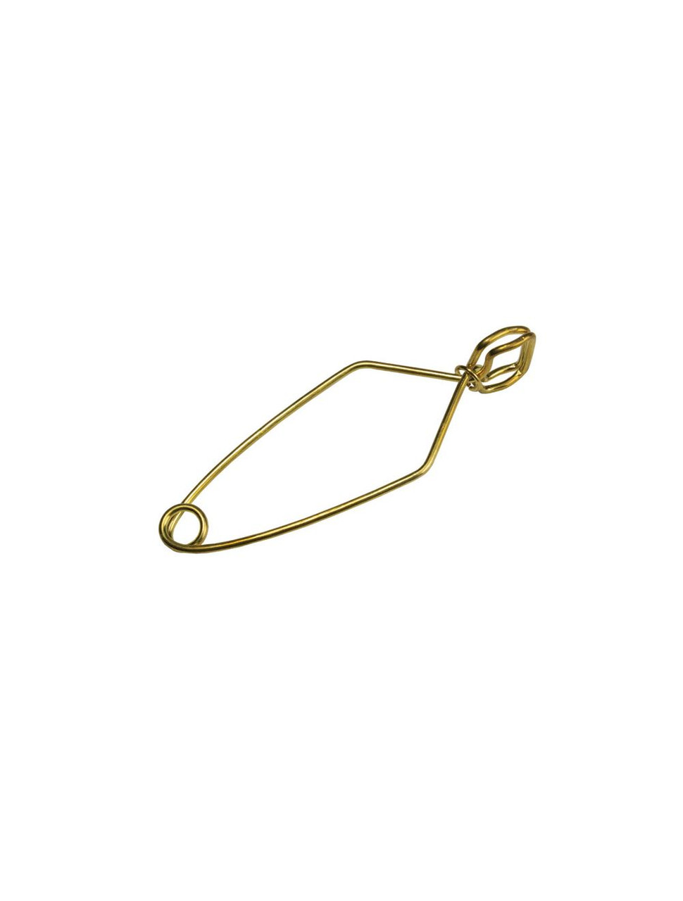 Self-closing steel wire clamp with brass finish is designed to securely hold test tubes.