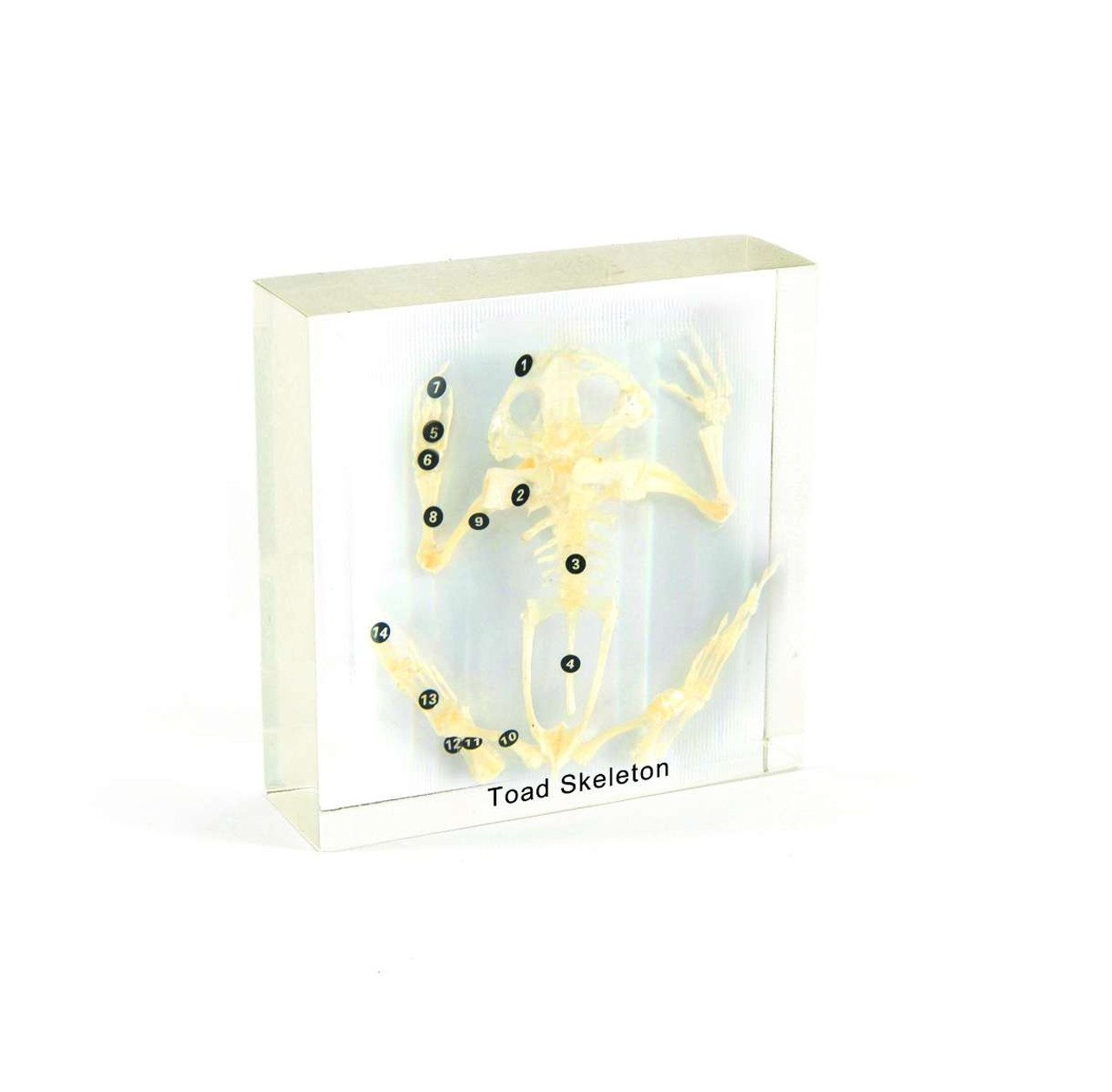 This specimen block has a REAL Toad Skeleton encased. The Skeleton is preserved and encased in clear resin material. It can be observed from every side to see details. This Skeleton comes in a black box and a detailed Information Card. The size of the acrylic is 3 x 3 x 1 in. Each specimen is unique and different and may differ from the picture shown.