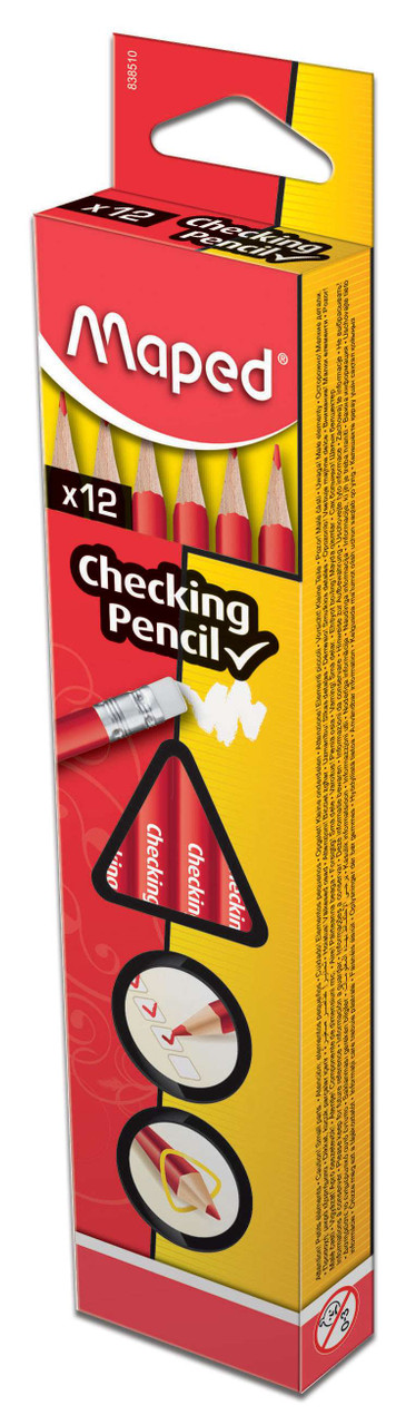 - Unlike a standard hexagonal pencil, the triangular body of the Maped Red Checking Pencils naturally index your fingers in the correct spots for a more comfortable hold, and they will not roll off of a desk or table!